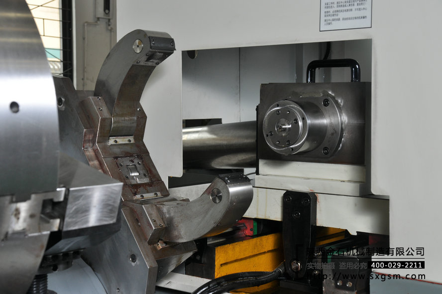 工件裝夾:工件左端用液壓卡盤(pán)夾持,右端用液壓中心架支撐。液壓卡盤(pán)和中心架可分別橫移,用于加工偏心孔。