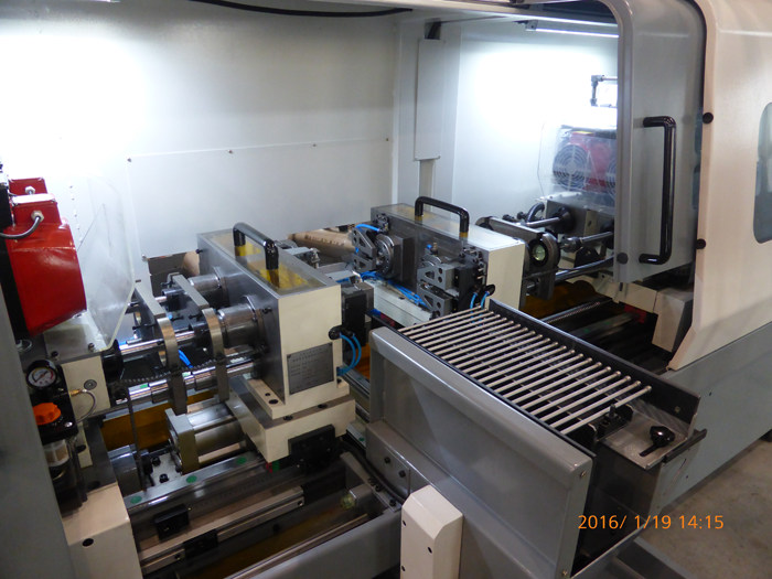 為了降低操作者勞動強度,該機床配置了自動上下料機構。該機構數(shù)控控制,一次安裝28支工件。送入加工區(qū)域后,機床會自動依次加工,直至完成所有28支工件的加工。送料架再退出加工區(qū),由人工將成品取走。