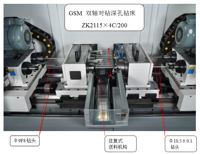 1. 機(jī)床結(jié)構(gòu)的選擇:因?yàn)?phi;9f8 (+0.013-0.035)孔徑公差要求非常高,又加之零件為大批量生產(chǎn),效率要求極高,所以深孔加工過程需要穩(wěn)定可靠,并且要方便刀具及工裝的調(diào)整。所以,機(jī)床的主軸數(shù)量選擇為2軸。如果選用4軸機(jī)床,則同時(shí)調(diào)整4支高精度的刀具,難度很大,也很難保證加工質(zhì)量。為了提高加工效率,考慮將左側(cè)的φ10.5±0.1深孔與φ9f8 (+0.013-0.035)同時(shí)加工。這樣可以保證工件一次裝夾,完成左右兩側(cè)孔的加工,大大提高了加工效率,加工效率比通常的四軸機(jī)床還要高很多。所以機(jī)床選擇為雙軸對鉆深孔鉆床。加工孔徑范圍:φ3~φ15。機(jī)床結(jié)構(gòu)參見下圖。