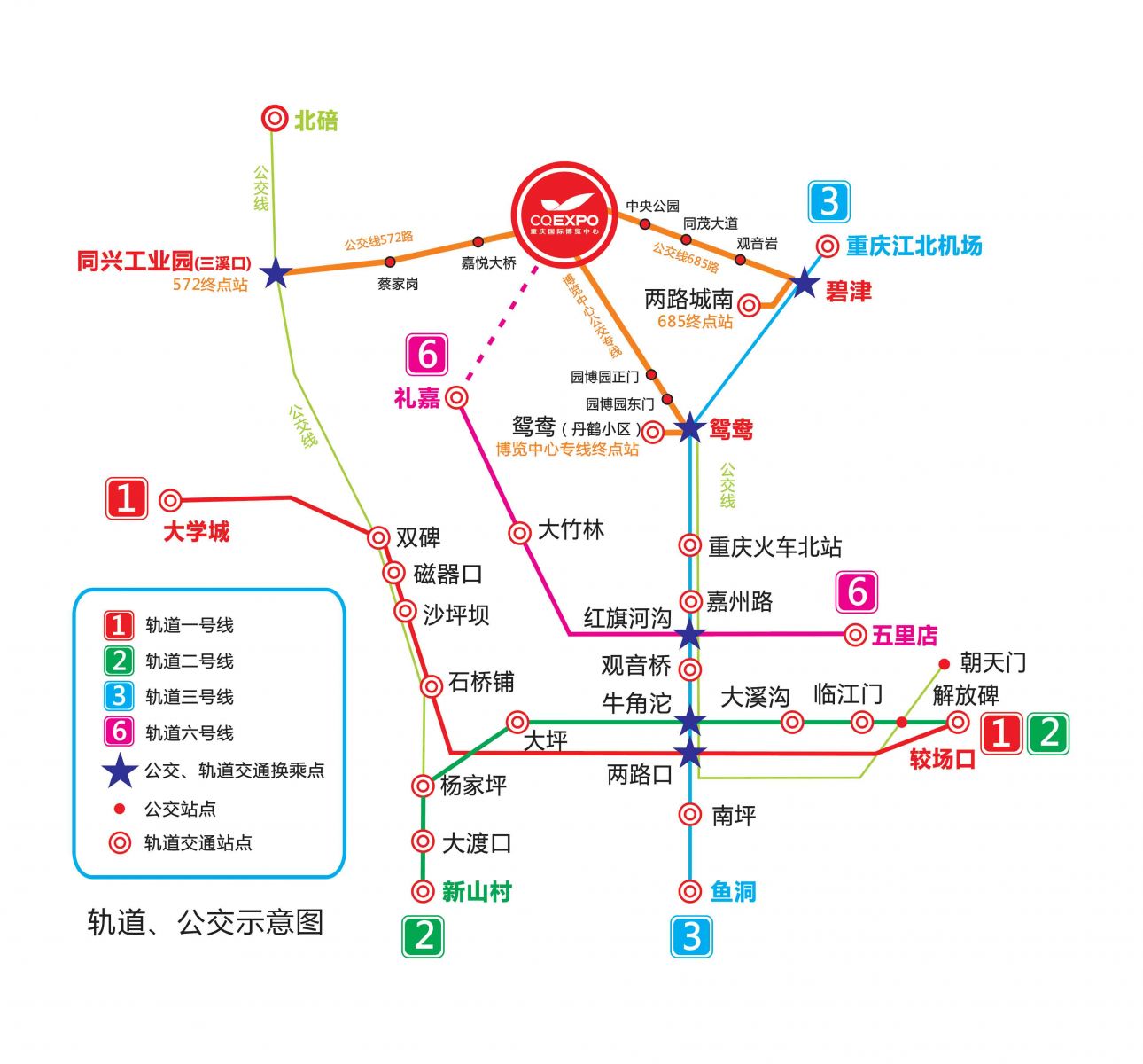 685路:渝北兩路城南 → 軌道碧津站(軌道接駁) → 雙鳳路 → 觀音巖 → 同茂大道 → 中央公園 → 博覽中心